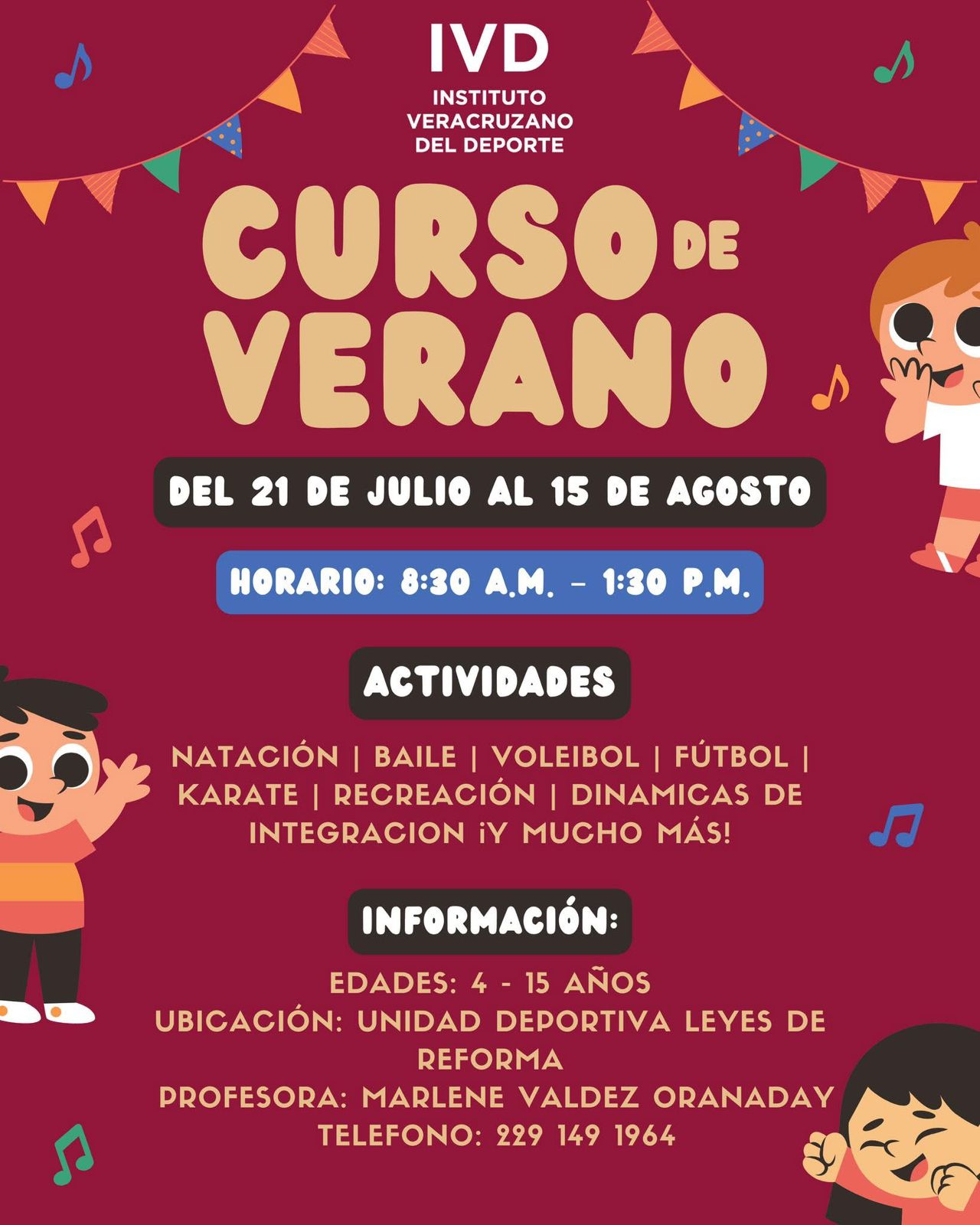 .- Con el objetivo de brindar un espacio seguro, divertido y formativo durante las vacaciones escolares, el Instituto Veracruzano del Deporte (IVD) invita a niñas, niños y adolescentes a participar en el Curso de Verano 2025, que se llevará a cabo del 21 de julio al 15 de agosto, en las instalaciones de la Unidad Deportiva Leyes de Reforma, de 8:30 a 13:30 horas.