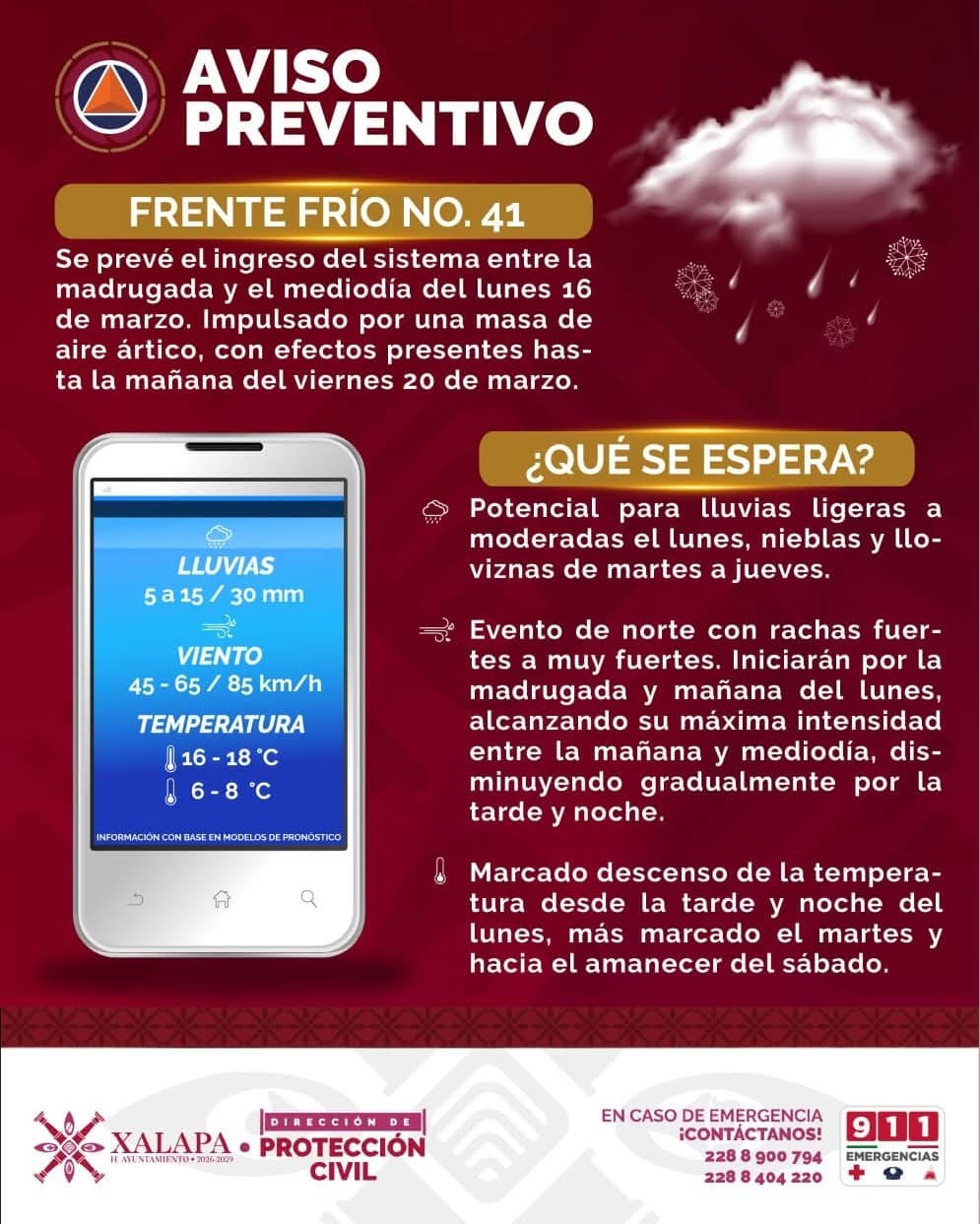 . - Ante el ingreso del Frente Frío 41, la Dirección de Protección Civil emitió un Aviso Preventivo a la población, ya que el fenómeno ocasionará disminución de temperaturas y viento intenso.