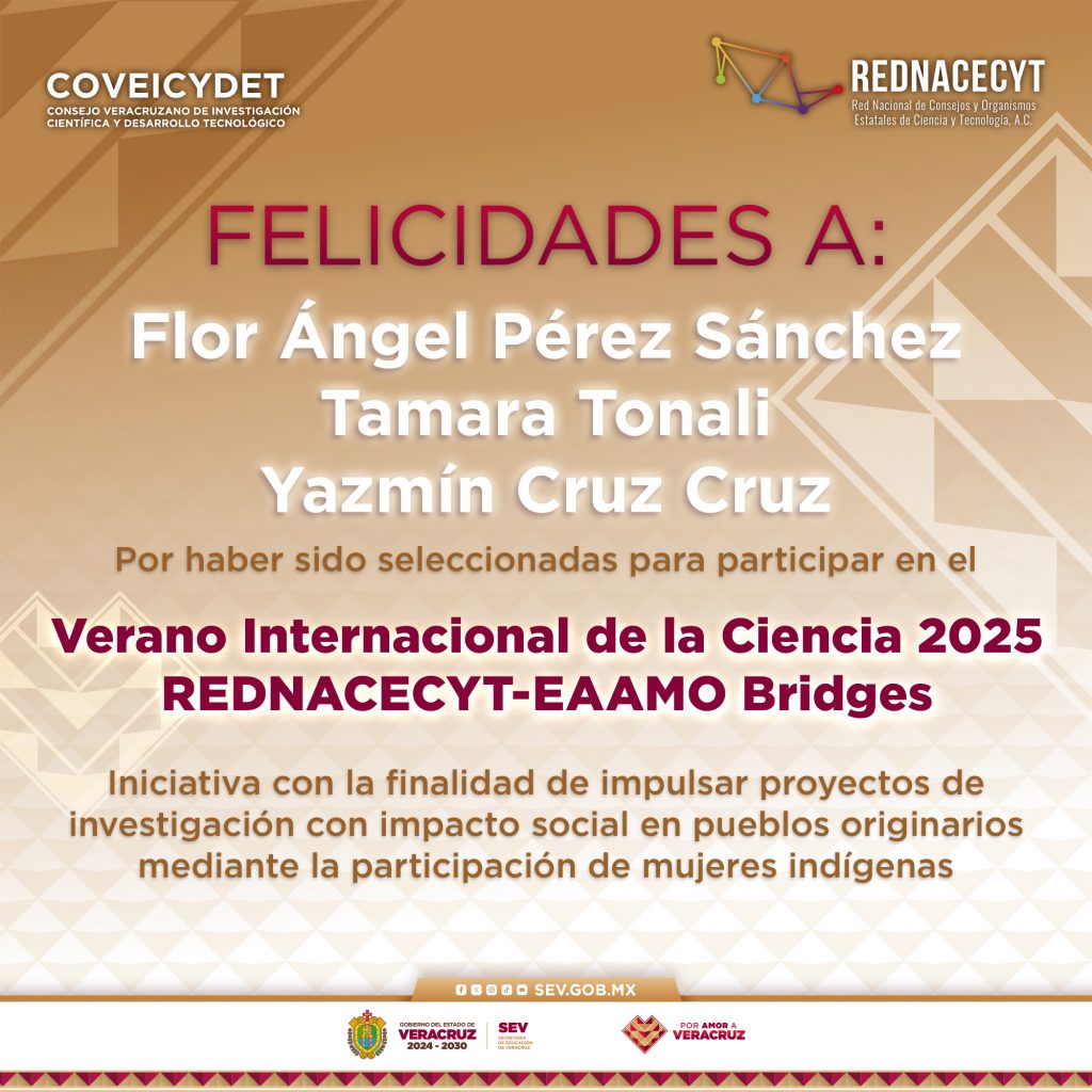 El COVEICYDET felicita con orgullo a las participantes veracruzanas Flor Ángel Pérez Sánchez, Tamara Tonali y Yazmín Cruz Cruz, quienes representarán al estado en esta importante iniciativa, demostrando que la ciencia también se construye desde las raíces culturales y la riqueza de los pueblos originarios.